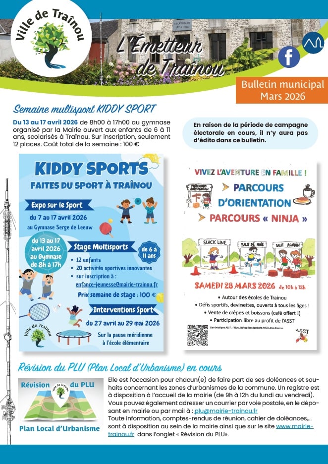 Retrouvez dans ce kiosque tous les bulletins municipaux mensuels depuis le début de la mandature, ainsi que le plan de la ville et les plans de randonnées à Trainou.